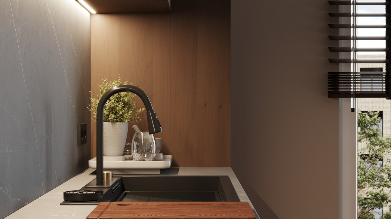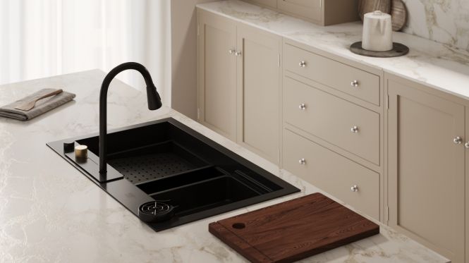 Koka dēlītis, kas iebūvēts izlietnē, ļaus vienlaicīgi gan griezt produktus, gan tos noskalot..
